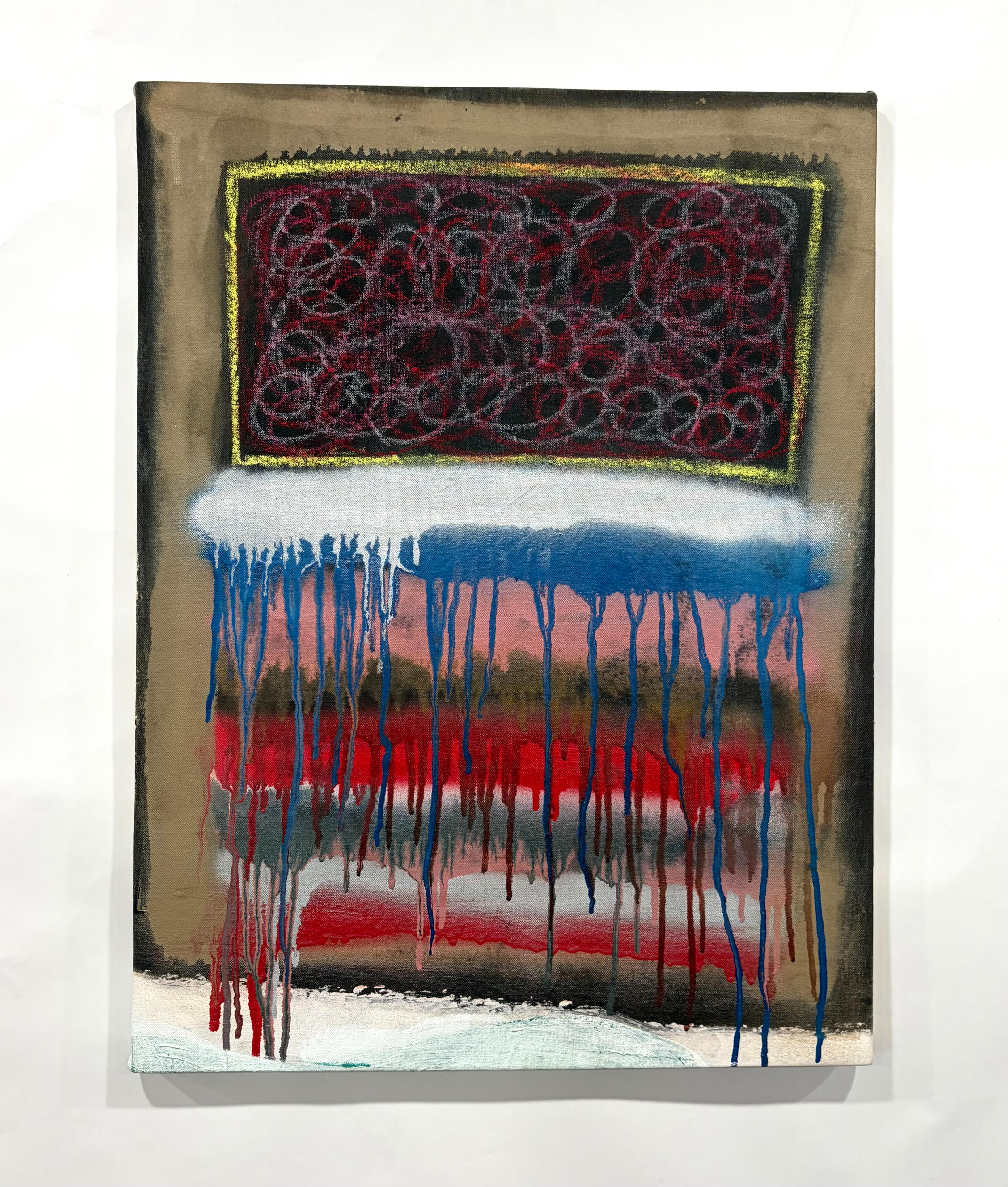 "Convalescence" Oil, oil stick, tempera stick, coffee, bronze dust, spray adhesive, charcoal and spray paint on canvas. 47" x 59" 2023